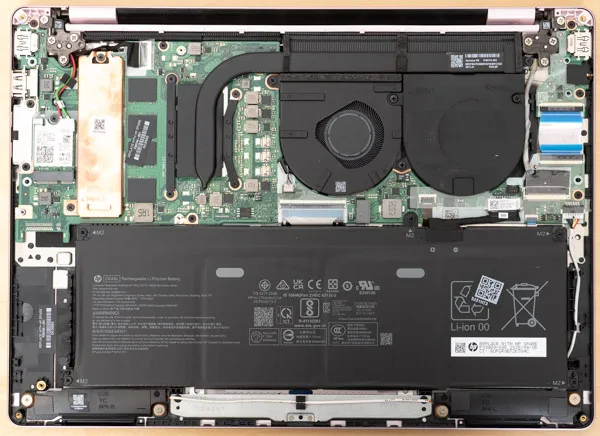Core Ultra 7 255H搭載モデルの内部はご覧のようになっています。2つの冷却ファンと2つのヒートパイプが搭載されています。メモリはオンボードです。