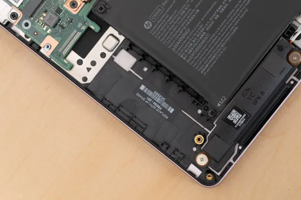 Core Ultra 7 255H搭載モデルの底面カバーを開けてみると、搭載されているSSDの他に、空いているM.2スロットがありました。ここにSSDを増設することができます。ただし、パーツの増設は自己責任でお願いします。
