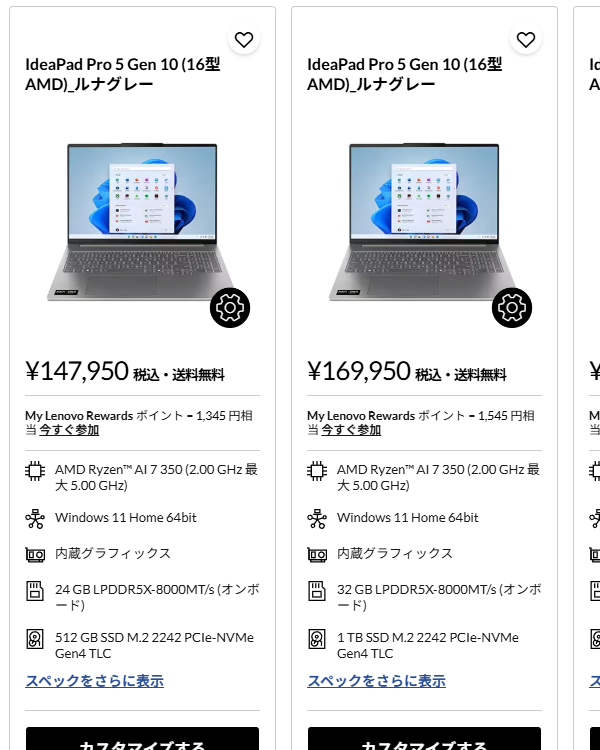 Ryzen AI 7 350、32GBメモリ、1TB SSD