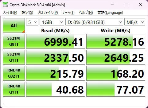 今回試しに、KIOXIAのPCIe Gen4 1TB SSDを増設してみたところ、きちんと認識され、速度も十分出ていました。