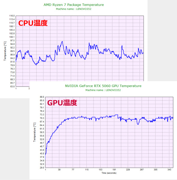 CPU温度は80℃台から90℃台後半とやや高めの温度です。GPU温度は70℃前後と問題ない温度です。