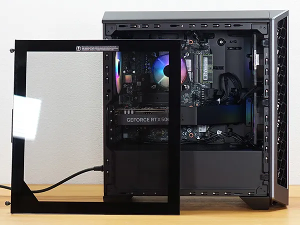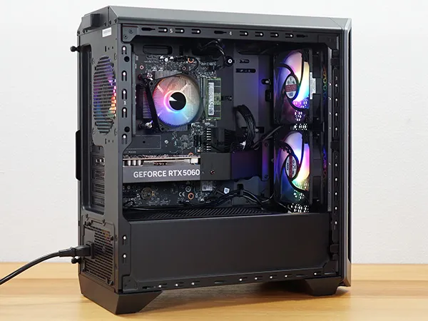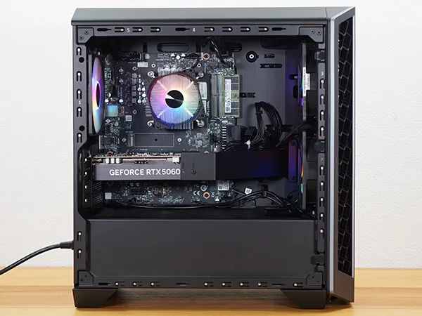なお、以下に搭載されていたパーツを紹介しますが、必ずしもこのパーツが搭載されるとは限りませんので、ご了承ください。ここでは、GeForce RTX 5060搭載モデルの内部を紹介しています。