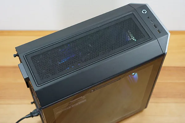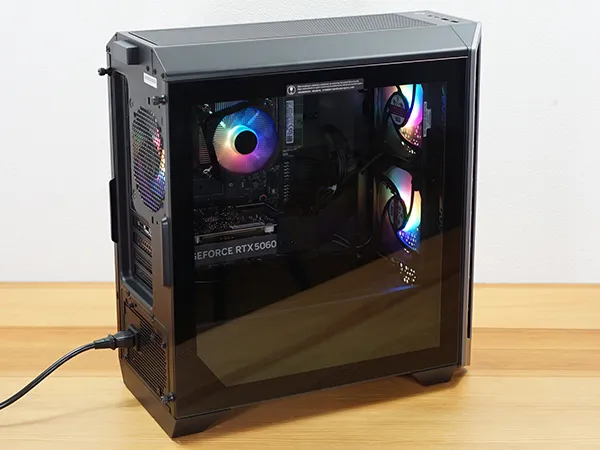 本製品は120mmのケースファンがフロントに2基、リアに1基搭載されており、CPUクーラーも空冷のため、アイドル時の動作音は比較的静かです。ゲーム中など、高負荷時はミドルクラスのゲーミングPCとしては普通の動作音です。