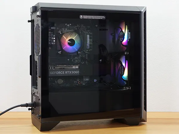 GeForce RTX 5060の一般的な推奨電源容量は550W程度と言われていますが、 本製品に搭載されていた電源容量は500Wでした。ノート向けCPUを採用することで、少ない電源でも高いパフォーマンスを実現しているようです。