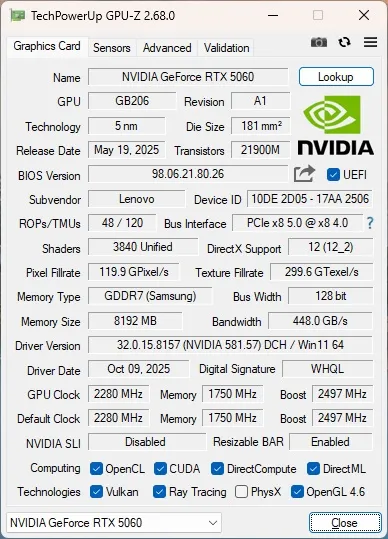 GPU-Zで確認したGeForce RTX 5060の情報は次の通りです。