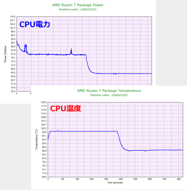 CPU電力は最初は80W付近と高い電力で動作し、CPU温度はほぼ100℃付近と非常に高い温度です。
