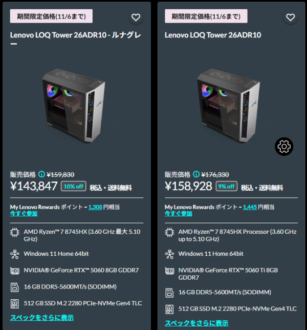 LOQ Tower 26ADR10は、ノート向けCPUを採用することで、ゲーミングPCとしては価格が比較的安くなっています。