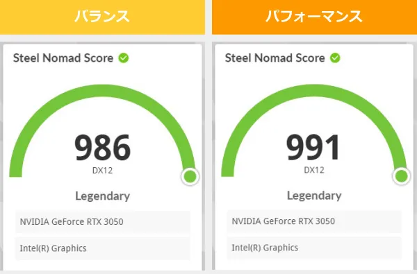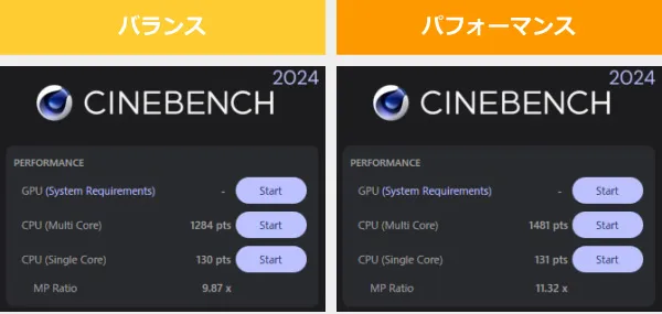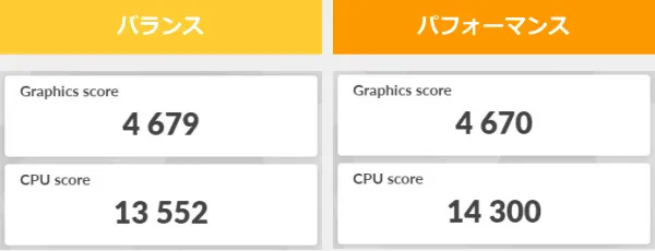 ここでは、デフォルトの「バランス」モードと、最も高いパフォーマンスが出る「パフォーマンス」モードで計測したベンチマークの結果を掲載します。