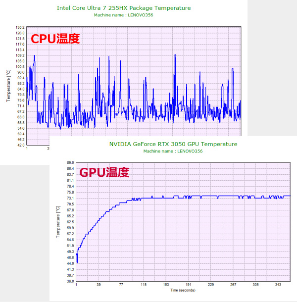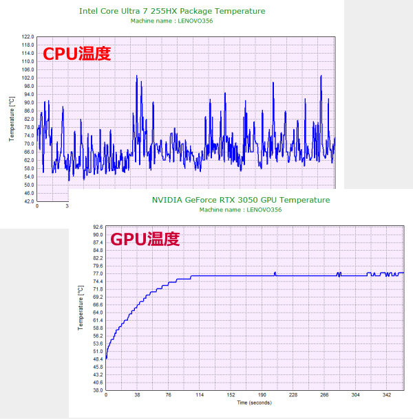 続いて、ゲーム時のCPUおよびGPU温度を計測しました。