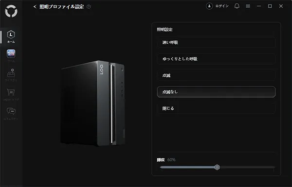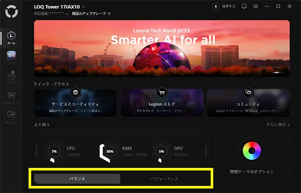 本製品では、プリインストールされているユーティリティツール「Legion Space」から動作モードを変更することができます。