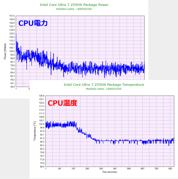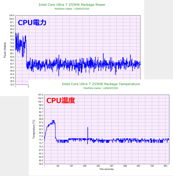 パフォーマンスモードでは、CPU電力は70W後半で動作し、CPU温度は90℃付近と、やや高めですが、高すぎることもなく、ずっとこのような負荷をかけなければ問題ない範囲の温度です。