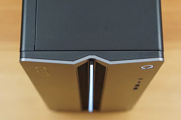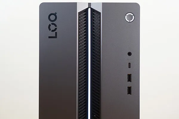 LOQ Tower 17IAX10は、ケース自体にややチープさは感じられるものの、フロントパネル中央に一直線に伸びるLEDライトバーが配置され、小さいながらも個性あるデザインとなっています。