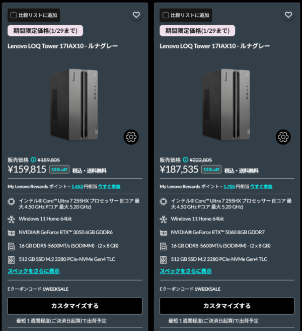 セール時には、RTX 3050搭載のエントリークラスが15万円台、RTX 5060搭載のミドルクラスでも18万円台から購入でき、価格が高騰している昨今では魅力的な価格設定となっています。
