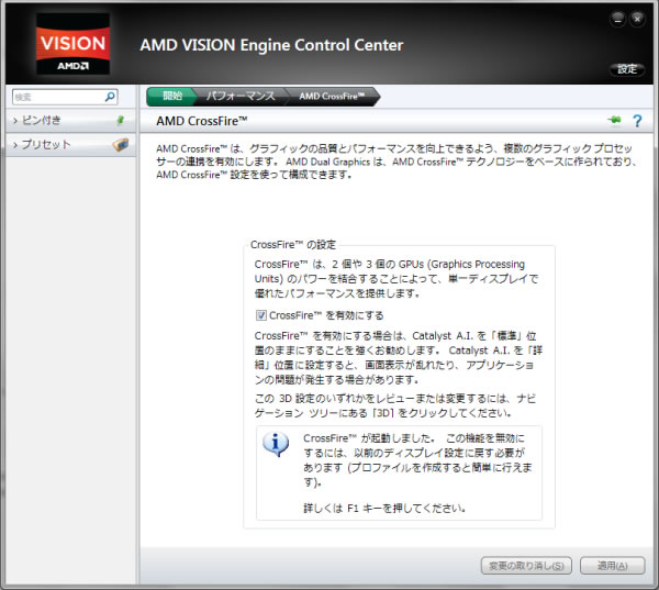 AMD Dual Graphicsはデフォルト状態で有効になっています。無効にしたいときは、Control CenterからCrossFireXの設定画面を使って変更可能です。