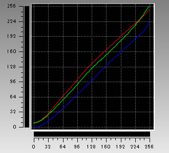 カラーマネージメントツールによるガンマ補正曲線を確認すると、青がかなり低めに調整されています(下図)。そのため実際の画面は、やや青みが強いです。また、赤や緑も直線的ではなく波打っています。色再現性は良いとは言えません。ただし、ほとんどのノートPC用液晶は、青みが強く、我々もそれに慣れているので、おそらく気にならないでしょう。