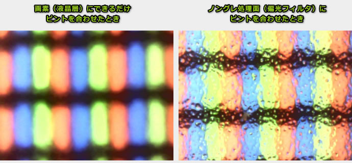 画素の拡大図です。画素にピントを合わせた時は、ぼやけすぎていて、画素の形まではわかりませんでした。ノングレア処理面にピントを合わせてみると、比較的なだらかです。ノングレア特有のギラツキを若干感じますが、ほとんど気にならない人が多いでしょう。