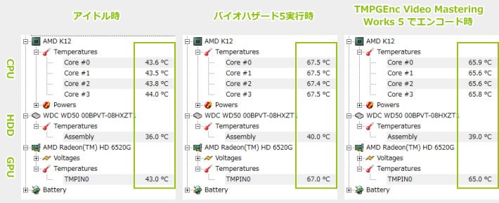 右図:TMPGEnc Video Mastering Works 5 でエンコード時の温度(x264、解像度1280x720でエンコード)