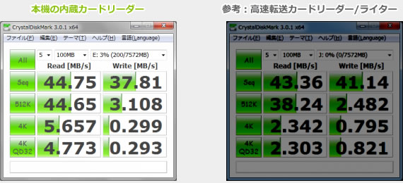 カードリーダー/ライターのCrystalDiskMarkのベンチマーク結果を次に掲載します。また、参考までに、高速転送可能なカードリーダー/ライターBSCRSDX3によるベンチマーク結果も掲載します(こちらは別PCでのテスト結果です)。