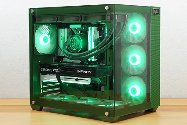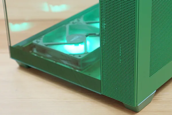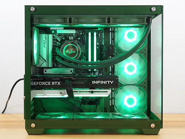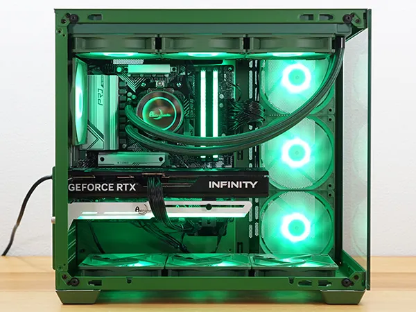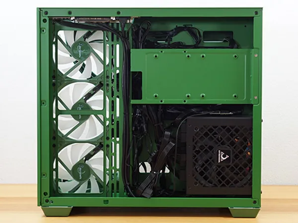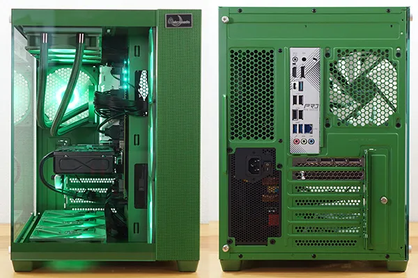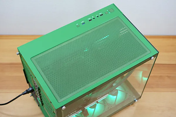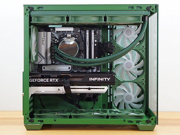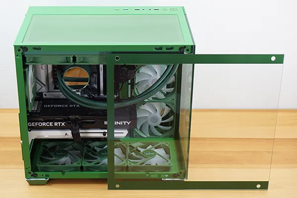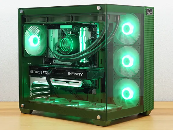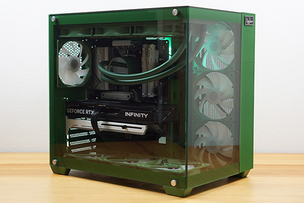 筐体からCPUクーラー、スリーブ、ケースファンまでグリーンで統一され、一体感があります。フロントと左サイドパネルが強化ガラスになっており、内部を広々と見渡せるピラーレスケースを採用しています。