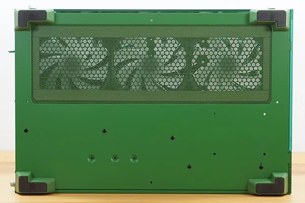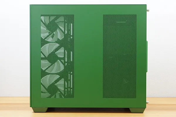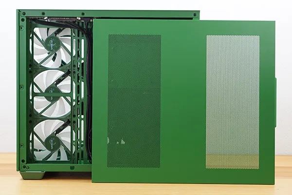 右サイドパネルには大きめの通気口が設けられており、ほぼメッシュ構造となっています。背面のネジを外すことでパネルを開くことができます。