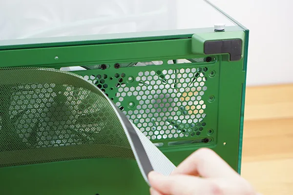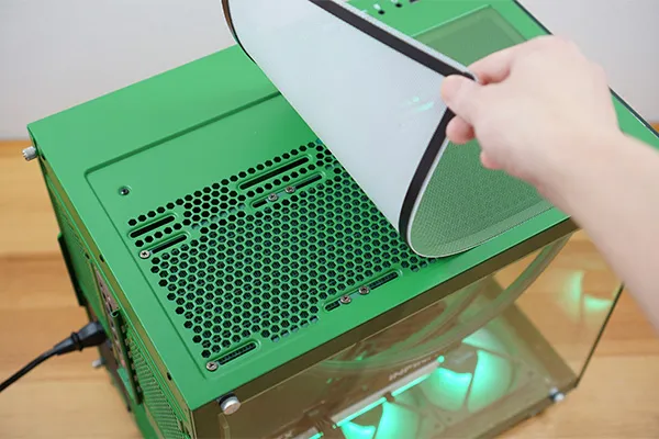 トップパネルには大きめの通気口が設けられており、マグネット式のメッシュフィルターを備えています。簡単に取り外せるため、掃除もしやすい構造です。