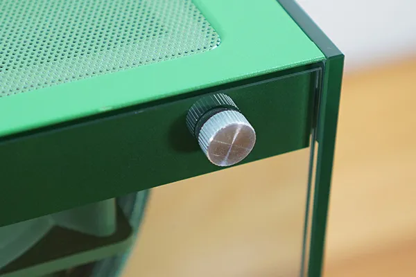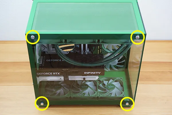 内部へアクセスするための左サイドのガラスパネルは、4点のネジで固定されています。開閉には多少手間がかかりますが、頻繁に開ける部分ではないため、実用上の影響は大きくありません。