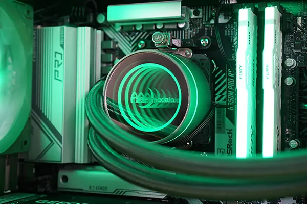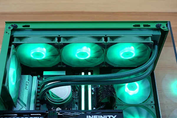標準で360mmの簡易水冷クーラーを搭載しています。メーカーは不明ですが、ポンプヘッドは鏡面仕上げとなっており、電源投入時には「Astromeda」のロゴが点灯します。ラジエーターはトップに配置され、RGBライティングにも対応するなど、見た目の演出にも優れています。さらに、スリーブもグリーンで統一されており、全体のカラーに統一感があります。