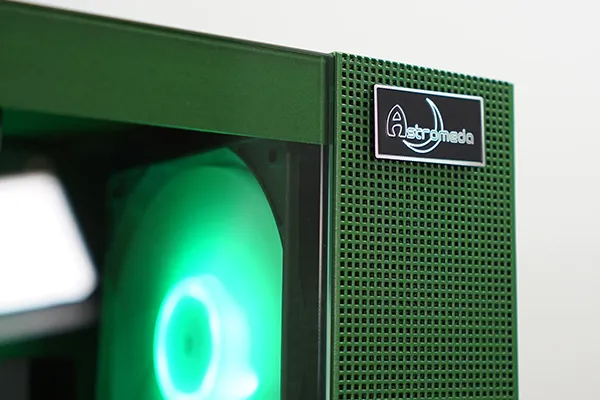 フロントパネルの右サイドには、ドット状の通気口が配置されており、上部にはAstromedaのロゴプレートが備わっています。ピクセルドットのようなデザインも特徴的で、見た目のアクセントになっています。