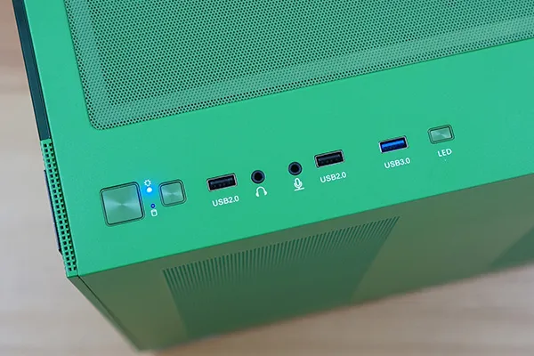 トップパネルのインターフェースです。電源ボタン、リセットボタン、USB 2.0 Type-A ×2、ヘッドホン端子、マイク端子、USB 3.0 Type-A ×1、LED切替ボタンがあります。