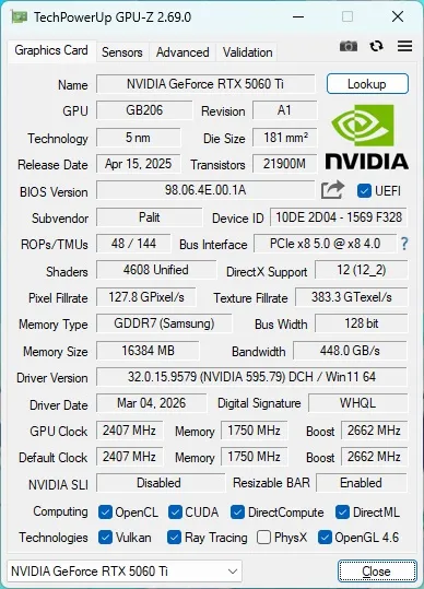 GPU-Zで確認したGeForce RTX 5060 Ti 16GBの情報は次の通りです。
