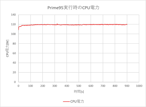Prime95で全CPUコアの使用率が100%になる高い負荷をかけたときのCPU電力およびCPU温度の推移を確認します。なお、本製品では360mmの大型簡易水冷クーラー を搭載しており、高負荷時でもCPUを安定して冷却します。