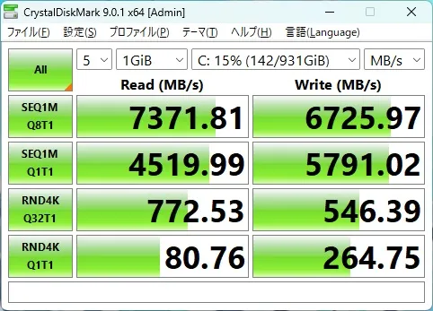 今回のレビュー機は、1TBのPCIe Gen4 SSDを搭載しており、アクセス速度も画像の通り高速です。