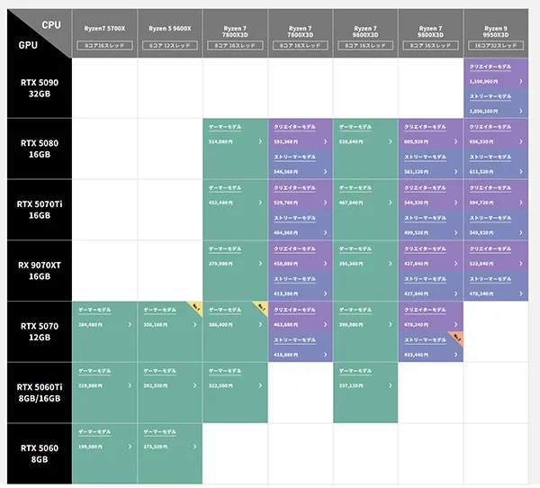 グラフィックスには、GeForce RTX 5000シリーズやRadeon RX 9000シリーズなど、ミドルクラスからハイエンドクラスまで幅広い構成を選択できます。