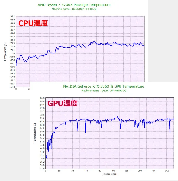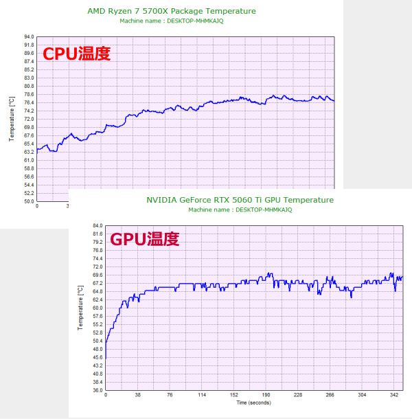 続いて、ゲーム時のCPUおよびGPU温度を計測しました。