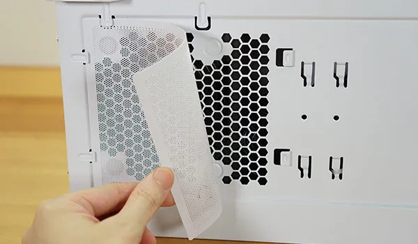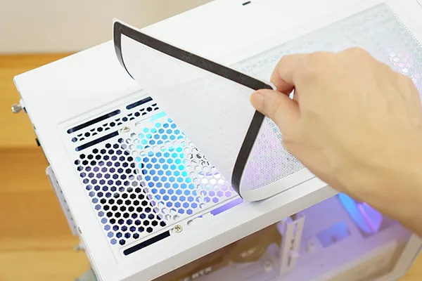 トップパネルは通気性の良いメッシュ仕様になっており、防塵フィルターはマグネット吸着式で掃除が楽です。取り外してそのまま水洗いも可能です。