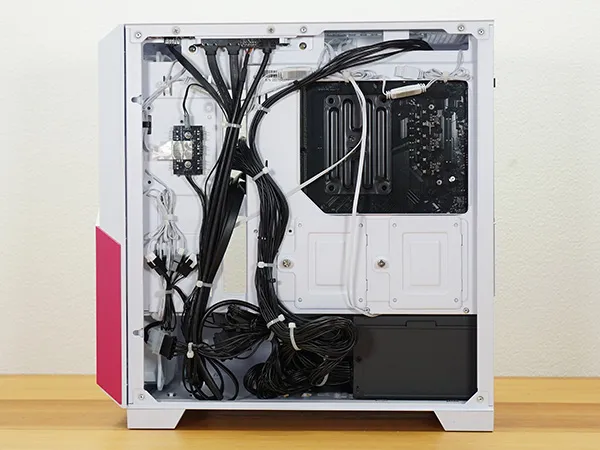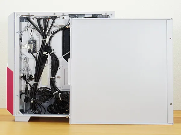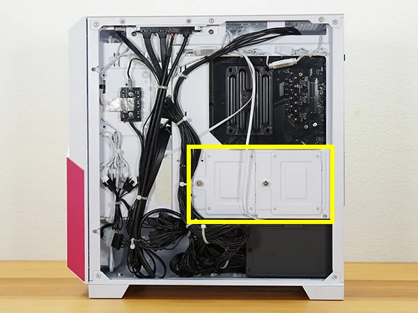 反対側のケース内部です。ケーブル類はこちらで綺麗にまとめられています。2.5インチSSDを2台設置できるスペースがあり、電源ユニットはこちらからアクセスします。