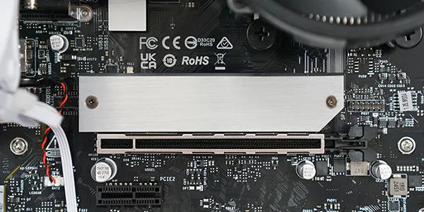 グラボの上にM.2 SSDがあります。メーカーは不明です。右下には空きのM.2スロットがあるので、後で増設も可能です。