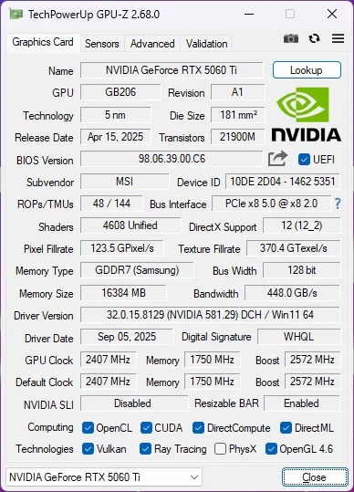 GPU-Zで確認したGeForce RTX 5060 Ti 16GBの情報は次の通りです。