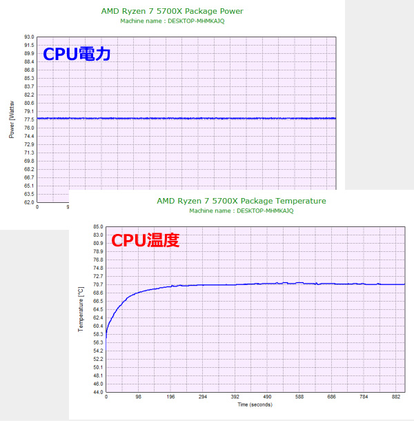 CPU電力は77W付近と、高い電力で動作し、CPU温度は70℃付近と、問題ない温度です。