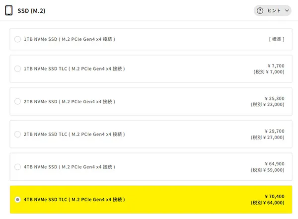 NEXTGEAR JGシリーズは、標準で1TBのM.2 SSDを搭載していますが、購入時のカスタマイズ画面から最大4TBまで増やすことができます。