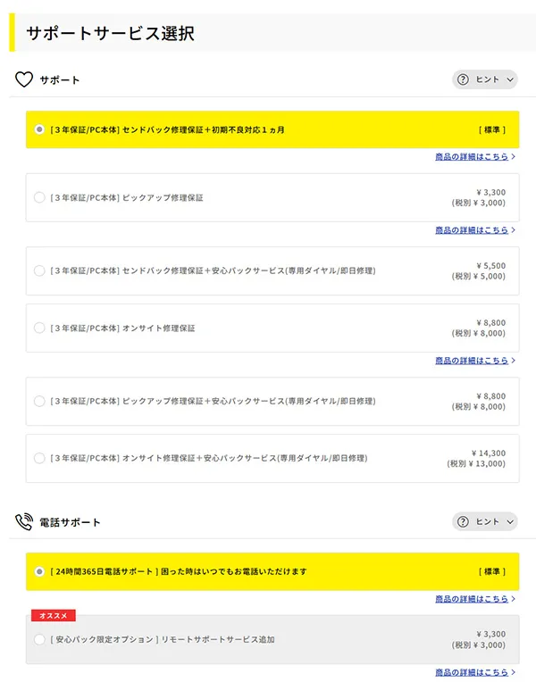 さらにオプションで様々なサポートサービスを追加でき、パソコンに詳しくない方でも安心して購入することができます。詳しくはこちらをご覧ください。