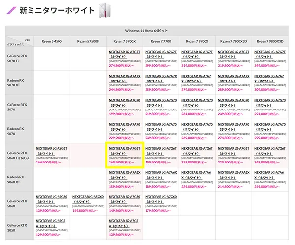 今回お借りしたのは、人気の高いRyzen 7 5700XにGeForce RTX 5060 Ti 16GBを搭載したNEXTGEAR JG-A7G6T(ホワイト)です。