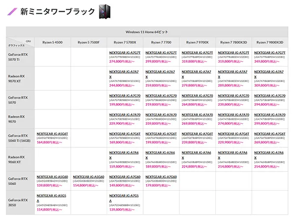 CPUには最大でRyzen 7 9800X3D、GPUにはエントリークラスのGeForce RTX 3050から、RTX 5000シリーズ、Radeon RX 9000シリーズを搭載したモデルがあり、価格も安く、コストパフォーマンスにも優れています。最小構成であれば、11万円台からと非常にリーズナブルな価格で購入することができます。