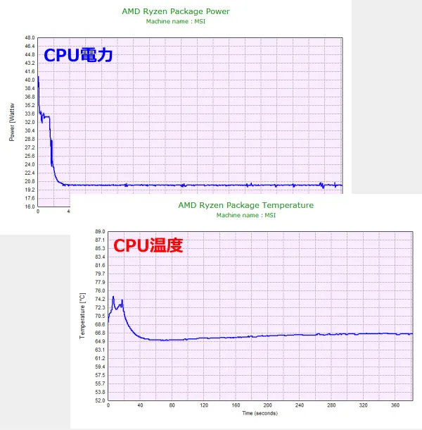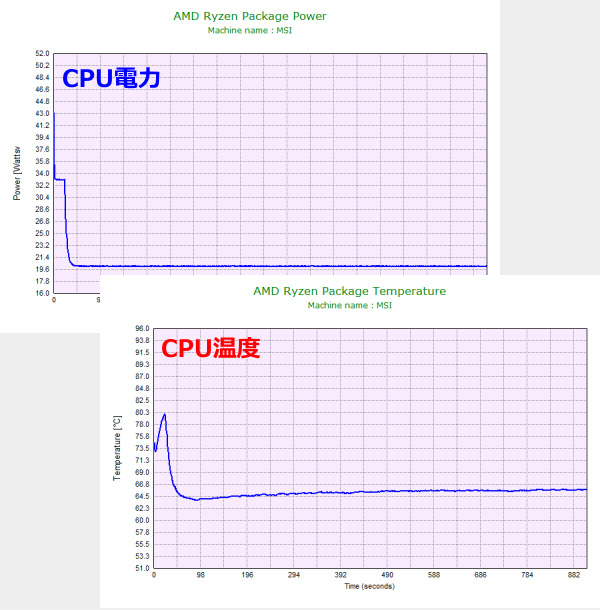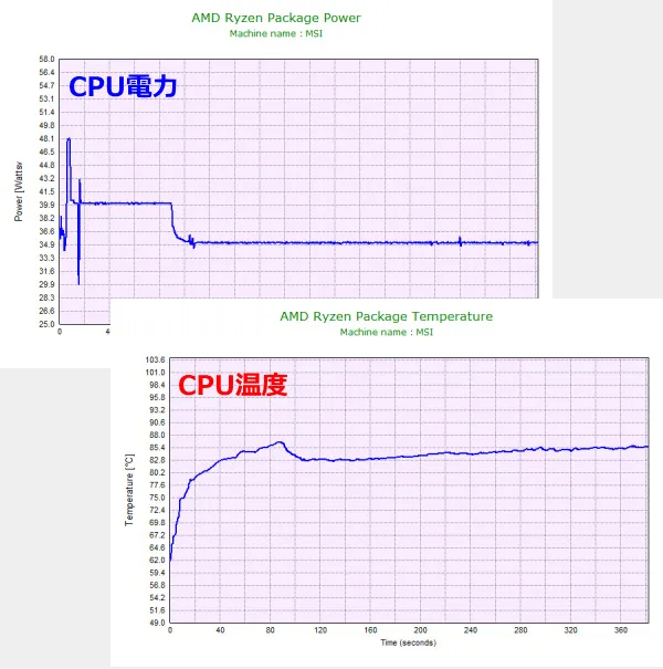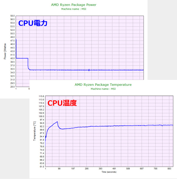 Prime95で全CPUコアの使用率が100%になる高い負荷をかけたときのCPU温度およびCPU電力の推移を確認します。なお、「手動」モードでは、SPLを35Wに設定して計測しています。