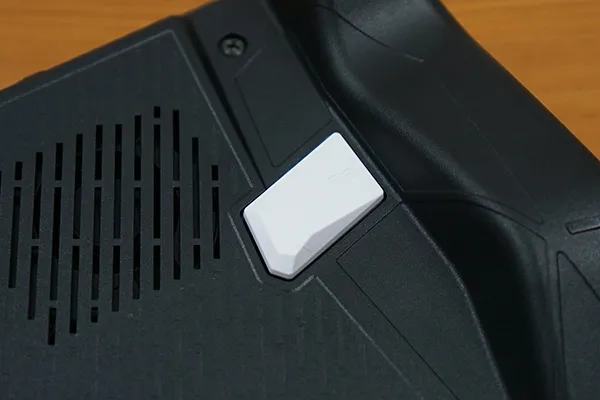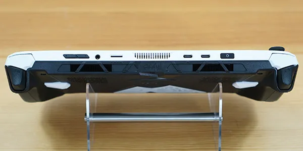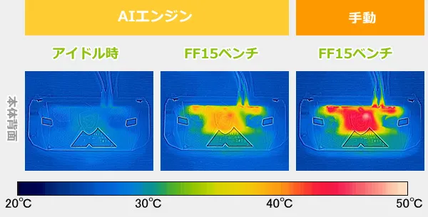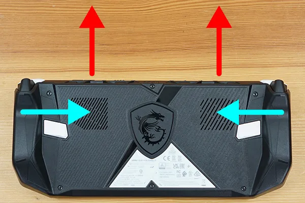 エアフローは背面から吸気し、上部から排気します。ゲーム中は、「AIエンジン」モードでは背面がほんのり暖かくなりますが、「手動」モードでは、結構熱くなります。ただ、グリップを握った状態では触れることはないので、不快感はありません。