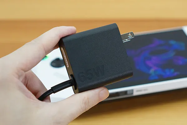 ACアダプターの容量は65Wです。小型なので持ち運びがしやすいです。