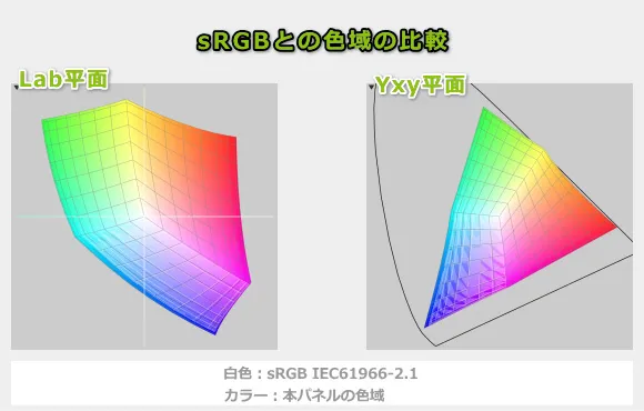 当サイトの計測で、sRGBカバー率は100%と広い色域です。最大輝度は、当サイトの計測では465cd/m2と高いです。