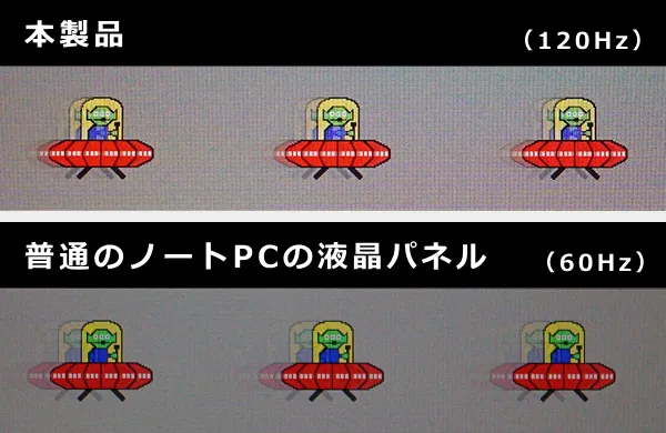 普通のノートPCは、60Hzで2フレーム前くらいまでの残像だったので、本製品の残像は少ないと言えます。