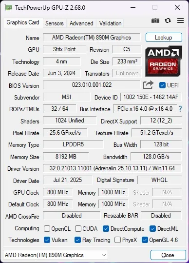 GPU | AMD Radeon Graphics | Intel Arc 140V GPU |