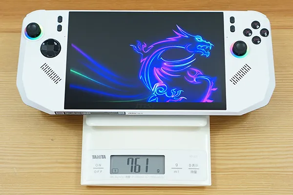 メーカーサイトでは約763.5gと記載されており、当サイトで計測した質量もほぼ同じでした。大容量バッテリーを搭載した8インチのポータブルゲーミングPCとしては軽い方です。